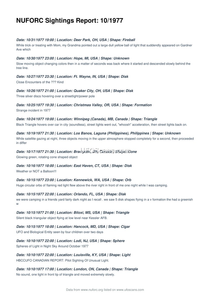 This document is a chronological list of 23 UFO sightings reported to the NUFORC for October 1977. It documents various aerial phenomena observed across North America and the Philippines.