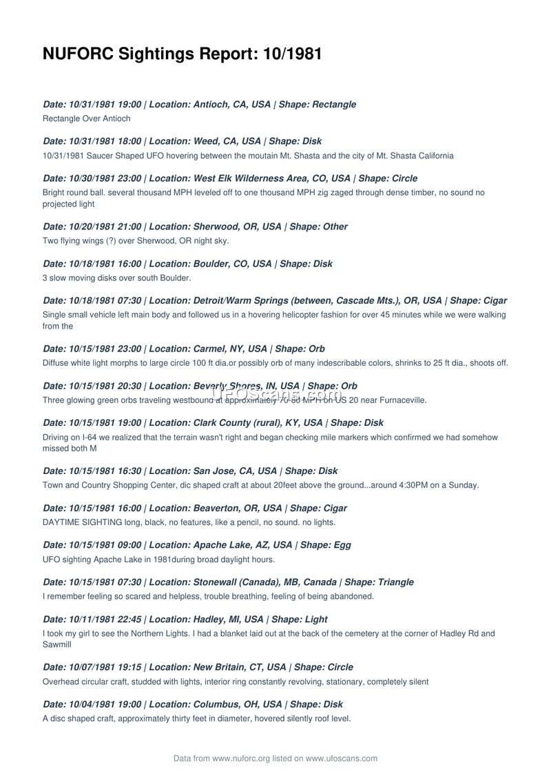 This document is a chronological list of nineteen UFO sightings reported to the National UFO Reporting Center in October 1981. It details various shapes, behaviors, and locations of reported aerial phenomena across North America.