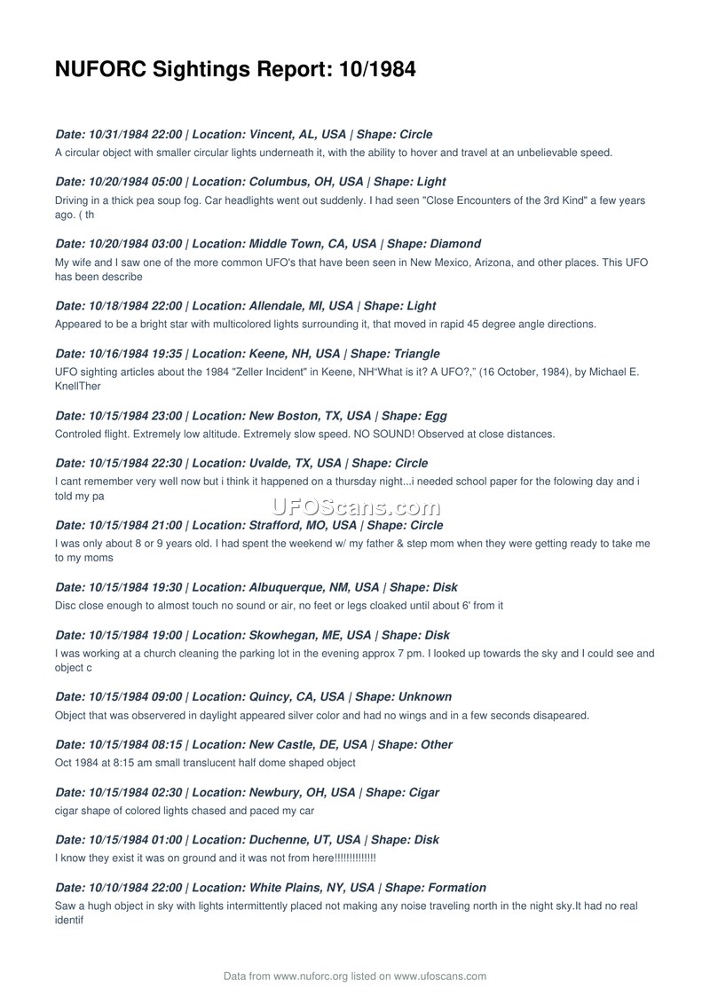 This document is a compilation of UFO sighting reports from October 1984, sourced from the National UFO Reporting Center (NUFORC). The report lists various incidents occurring across the United States and one in the United Kingdom. Witnesses reported a wide variety of shapes, including circles, lights, diamonds, triangles, eggs, disks, cigars, formations, and other unidentified objects. Descriptions of the phenomena range from silent, low-altitude, slow-moving objects to high-altitude, fast-moving craft exhibiting violent maneuvering. Specific incidents include a report of a car's headlights failing in fog, a sighting of a translucent football-shaped object over an airport, and a V-shaped formation of lights. The document also references the 'Zeller Incident' in Keene, New Hampshire, which was the subject of a local news article in October 1984. The reports are presented chronologically, detailing the date, time, location, and shape of the observed phenomena, with brief anecdotal descriptions provided by the witnesses.