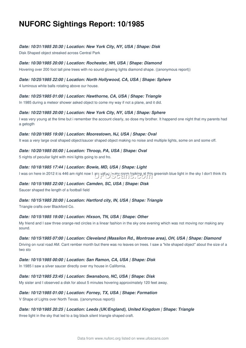 This document is a chronological list of UFO sightings reported to the National UFO Reporting Center in October 1985. It documents various aerial phenomena observed across the United States and the United Kingdom.