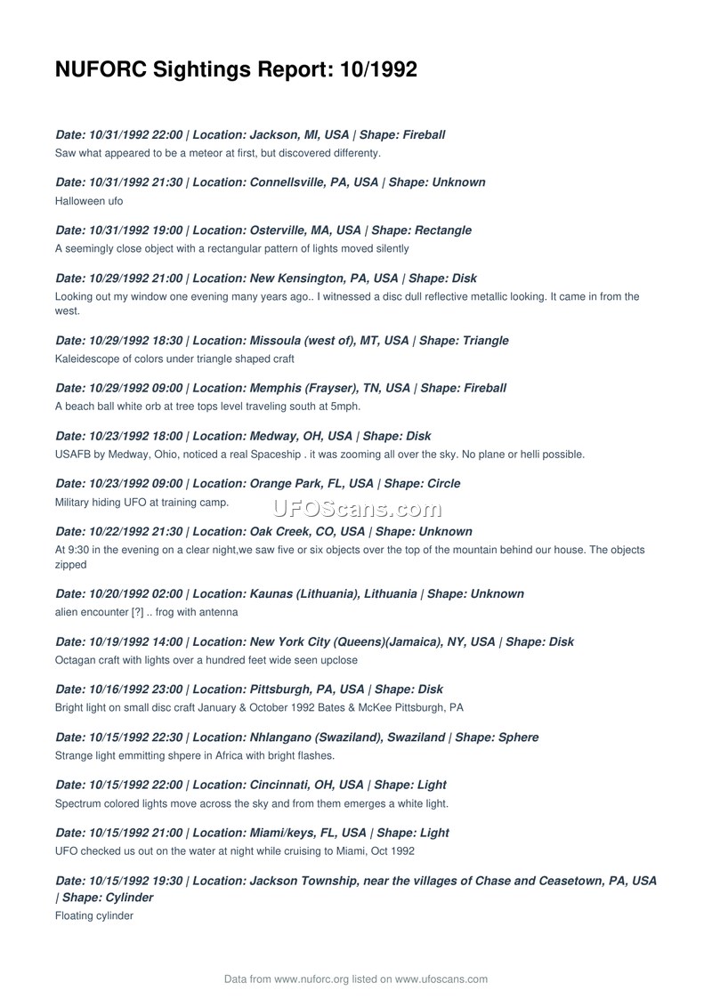 NUFORC Sightings Report: 10/1992