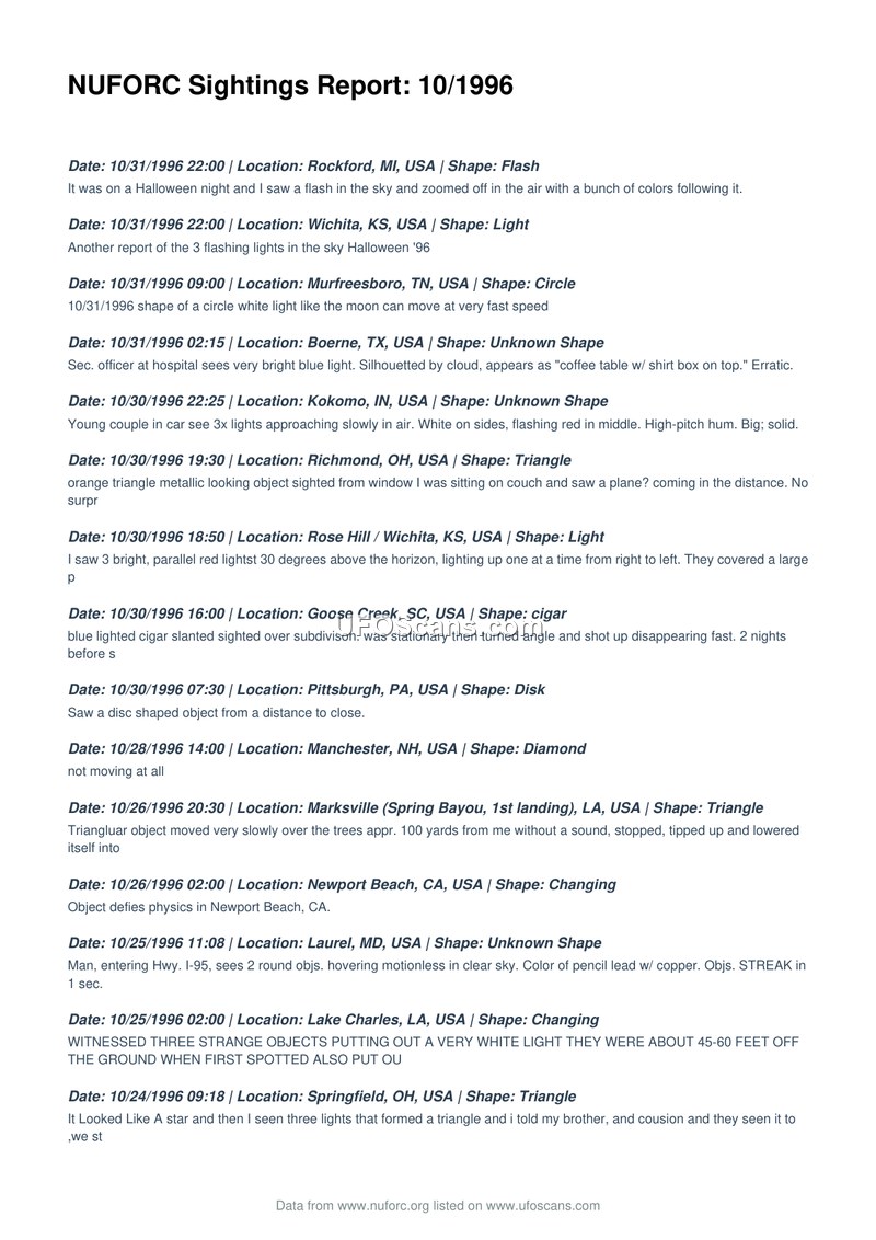 A chronological list of UFO sighting reports submitted to the National UFO Reporting Center during October 1996. It documents diverse aerial phenomena reported by the public across multiple geographic locations.