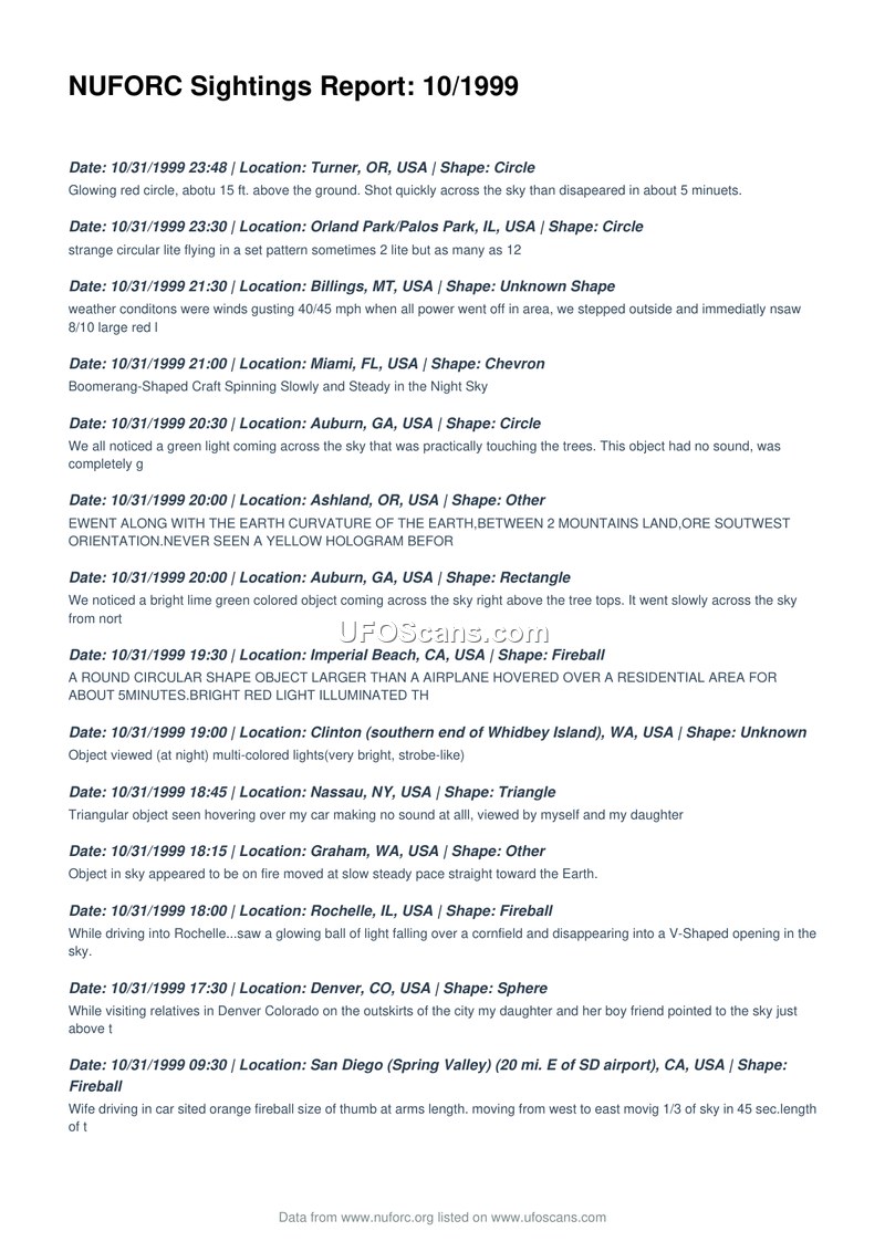 This document is a comprehensive compilation of Unidentified Aerial Phenomena (UAP) sighting reports submitted to the National UFO Reporting Center (NUFORC) during the month of October 1999. The reports are presented in chronological order, spanning from October 1st through October 31st. Each entry provides the date and time of the incident, the location, the reported shape of the object, and a brief narrative description provided by the witness. The sightings cover a wide geographic range, primarily within the United States, but also including reports from Canada, the United Kingdom, India, South Africa, Malaysia, and Belgium. The descriptions of the objects are highly varied, including shapes such as circles, triangles, fireballs, cigars, disks, chevrons, and spheres. Witness accounts frequently describe unusual flight characteristics, such as hovering, rapid acceleration, silent movement, and erratic maneuvers. Some reports mention specific interactions or observations, such as objects appearing to be chased by fighter jets, objects hovering over residential areas or military installations like Nellis Air Force Base, and instances of missing time or electrical interference. Several witnesses identify themselves as having professional backgrounds, including former pilots or Department of Defense employees. The document serves as a raw data repository for public reports, capturing the subjective experiences of numerous individuals who observed phenomena they could not identify. The reports vary in detail, with some providing specific environmental context, such as weather conditions or the presence of other aircraft, while others are brief, noting only the appearance of lights in the sky. The compilation reflects the diverse nature of UAP reporting at the turn of the millennium, highlighting the persistent public interest in and observation of unexplained aerial events.