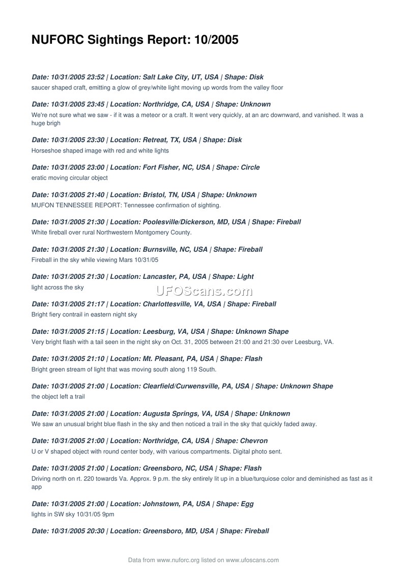 NUFORC Sightings Report: 10/2005