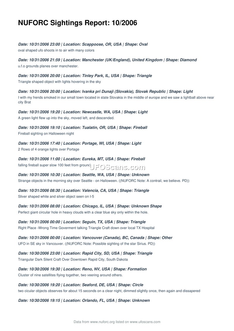 This document is a monthly compilation of hundreds of public-submitted UFO sighting reports from October 2006, categorized by date, location, and object shape. It serves as a historical record of public observations and NUFORC's initial notes on potential conventional explanations.