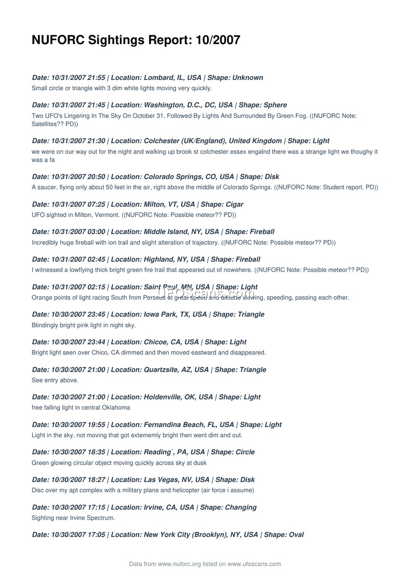 This document is a monthly compilation of hundreds of public-submitted UFO/UAP sighting reports from October 2007, categorized by date, location, and object shape. It serves as a historical record of public observations and NUFORC's preliminary notes on potential explanations.