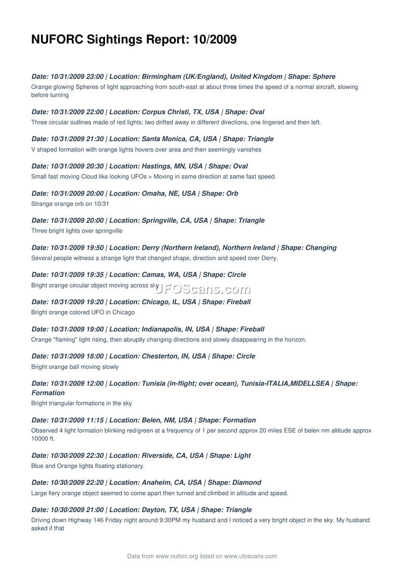 This document is a comprehensive compilation of UFO and UAP sighting reports submitted to the National UFO Reporting Center (NUFORC) for the month of October 2009. The report spans 19 pages and details hundreds of individual accounts from witnesses across the United States, Canada, the United Kingdom, South Africa, and other international locations. The sightings are presented in reverse chronological order, beginning on October 31, 2009, and concluding on October 1, 2009. The descriptions provided by witnesses are diverse, covering a wide array of shapes, including spheres, triangles, ovals, discs, cigars, fireballs, and various formations of lights. Many reports describe objects that exhibit unconventional flight characteristics, such as sudden changes in direction, extreme speeds, hovering, and silent movement. Some witnesses report objects that appear to be metallic or solid, while others describe them as pulsating lights or translucent phenomena. Several accounts mention specific environmental contexts, such as sightings near airports, over highways, or in proximity to residential areas. A few reports include anecdotal details about the witnesses' personal experiences, such as taking photographs, observing objects with family members, or witnessing events that they perceived as anomalous or potentially extraterrestrial. The document serves as a raw data repository for public reports, with minimal editorial intervention, though some entries include brief notes from NUFORC regarding potential explanations, such as advertising lights, the International Space Station, or student reports. The report provides a snapshot of the public's perception and observation of aerial phenomena during this specific month in 2009.