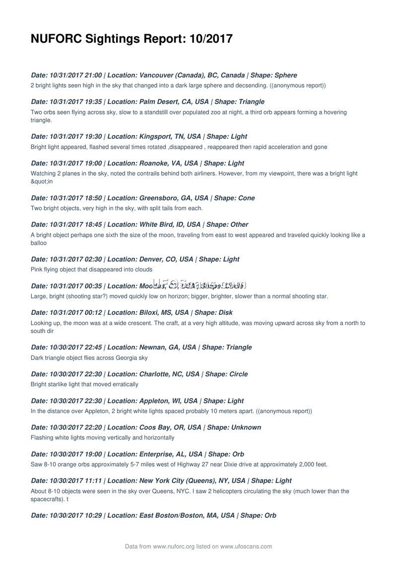 This document is a monthly compilation of hundreds of public UFO/UAP sighting reports submitted to the National UFO Reporting Center (NUFORC) in October 2017. It provides a chronological record of witness observations across multiple countries, detailing a wide variety of object shapes, behaviors, and reported characteristics.