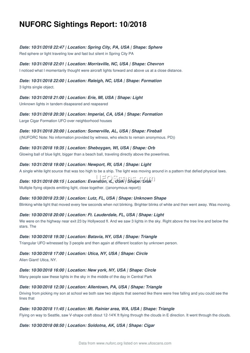This document is a monthly compilation of UAP sighting reports submitted to the National UFO Reporting Center in October 2018. It catalogs hundreds of individual accounts of unidentified aerial objects globally, including notes on potential conventional explanations for some events.