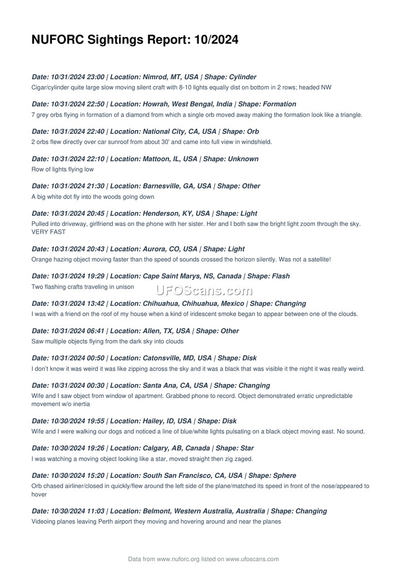 This document is a comprehensive compilation of Unidentified Aerial Phenomena (UAP) sighting reports submitted to the National UFO Reporting Center (NUFORC) for the month of October 2024. The report spans 24 pages and details hundreds of individual accounts from witnesses across the globe, including the United States, Canada, Australia, the United Kingdom, India, and several other nations. The reports describe a wide variety of phenomena, ranging from simple lights in the sky to complex, structured craft. Common shapes reported include orbs, triangles, cigars, cylinders, disks, and formations of multiple objects. Many witnesses describe erratic flight patterns, including sudden stops, sharp turns, rapid acceleration, and hovering, often noting that the objects did not behave like conventional aircraft, satellites, or drones. Several reports mention the absence of sound, while others note specific visual characteristics such as pulsating lights, metallic surfaces, or the ability to change shape. Some accounts include reports of physical or electromagnetic effects, such as electronic interference, strange sounds, or physical marks on the witness. The document serves as a raw data repository, capturing the subjective experiences of observers who reported their sightings to NUFORC during this period. The entries are organized chronologically, providing a snapshot of the global UAP activity reported to the organization throughout October 2024.