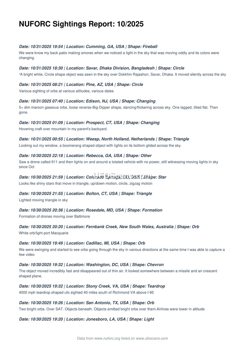 This document is a comprehensive compilation of Unidentified Aerial Phenomena (UAP) sighting reports recorded by the National UFO Reporting Center (NUFORC) for the month of October 2025. The report spans 24 pages and details hundreds of individual accounts submitted by witnesses from across the globe, including the United States, Canada, the United Kingdom, Australia, Ireland, India, Mexico, and various other nations. The sightings are presented in reverse chronological order, beginning with reports from October 31, 2025, and concluding with reports from October 1, 2025. The descriptions provided by witnesses are highly varied, encompassing a wide array of shapes, including orbs, triangles, cigars, discs, chevrons, teardrops, and amorphous lights. Many reports emphasize the unconventional flight characteristics of the objects, such as extreme speeds, sudden stops, erratic movements, silent operation, and the ability to change shape or disappear instantaneously. Several witnesses describe objects interacting with other aircraft, hovering over specific locations like radio towers or defense installations, or appearing in formations. Some accounts include specific details such as the presence of multiple objects, pulsating lights, or the objects' reactions to being observed. The document serves as a raw data repository, capturing the subjective experiences of individuals who reported their observations to NUFORC. The reports vary in detail, with some providing brief, singular observations and others offering more descriptive narratives of prolonged encounters. The document also notes the use of various technologies by witnesses, including cameras, dash cams, and night vision equipment, to document these events. The compilation provides a snapshot of the global frequency and diversity of UAP sightings during this specific timeframe, reflecting the ongoing public interest and reporting activity regarding these phenomena.