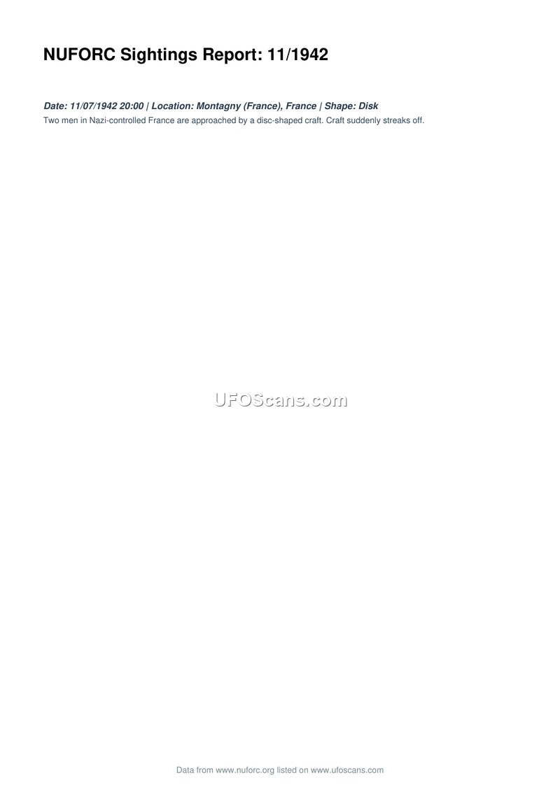 This document is a sighting report from the National UFO Reporting Center (NUFORC) regarding an incident that occurred in November 1942. On November 7, 1942, at 20:00, two individuals located in Montagny, France, reported an encounter with an unidentified aerial phenomenon. The witnesses, who were in a region described as Nazi-controlled France at the time, observed a disc-shaped craft that approached them. Following the approach, the craft reportedly streaked away from the scene.