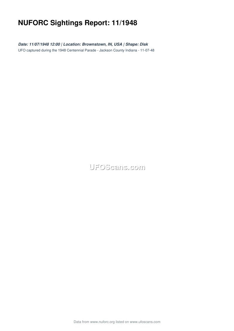 This document is a sighting report from the National UFO Reporting Center (NUFORC) regarding an event that occurred on November 7, 1948, in Brownstown, Indiana. The report indicates that a disk-shaped object was observed at 12:00. The sighting took place during the 1948 Centennial Parade held in Jackson County, Indiana.