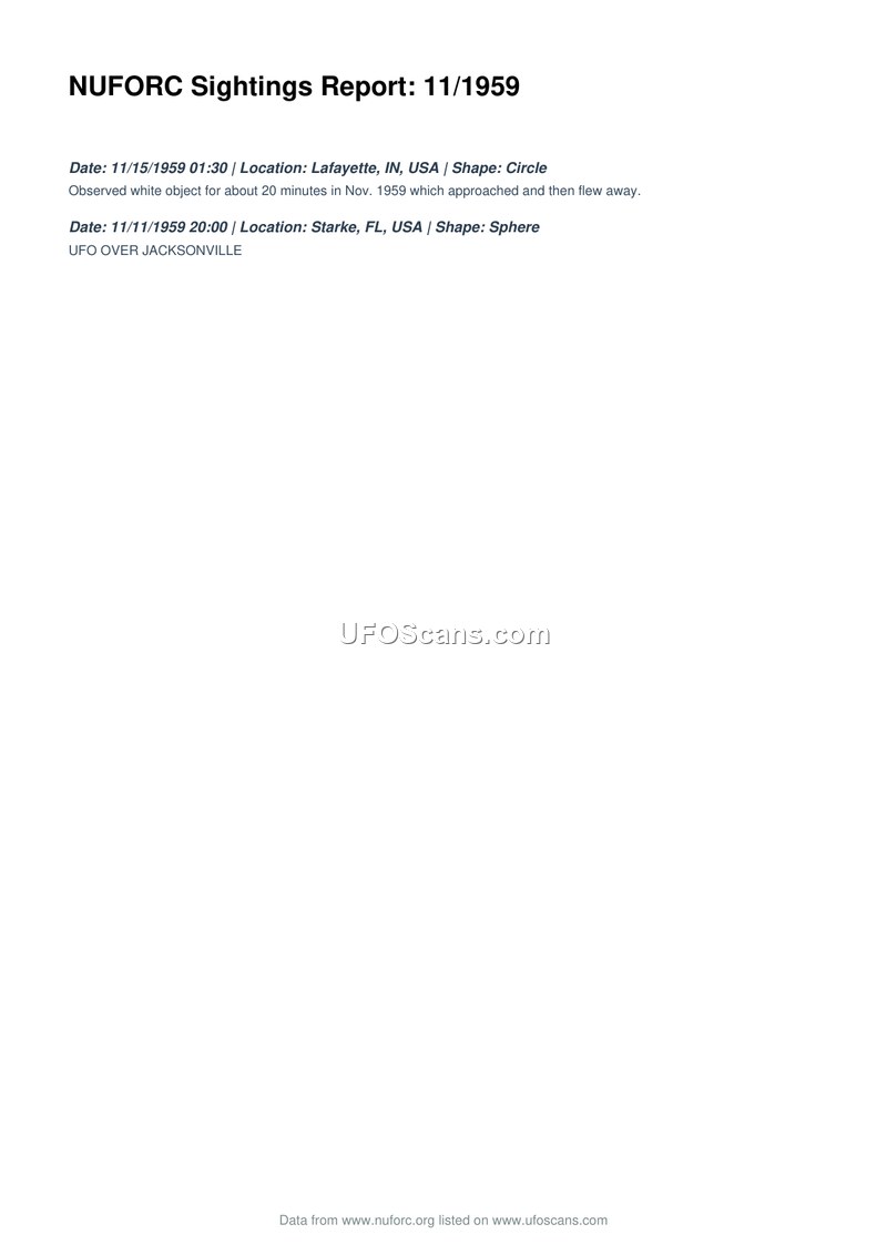 This document, titled 'NUFORC Sightings Report: 11/1959', provides a brief summary of two separate unidentified aerial phenomena sightings reported to the National UFO Reporting Center (NUFORC) during November 1959. The first incident occurred on November 15, 1959, at 01:30 in Lafayette, Indiana. The witness reported observing a white, circular object for approximately 20 minutes, noting that the object approached the observer before flying away. The second incident occurred on November 11, 1959, at 20:00 in Starke, Florida. This report is categorized simply as a 'UFO OVER JACKSONVILLE' and describes the object as a sphere. The document serves as a historical record of these specific reports.