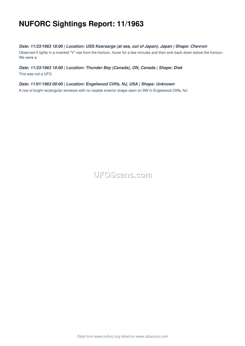 This document is a compilation of three distinct sighting reports recorded by the National UFO Reporting Center (NUFORC) for the month of November 1963. The first entry, dated November 23, 1963, at 18:00, describes an observation from the USS Kearsarge, located at sea off the coast of Japan. The witness reported five lights arranged in an inverted 'V' formation that rose from the horizon, hovered for several minutes, and subsequently descended back below the horizon. The second entry, also dated November 23, 1963, at 10:00, concerns a report from Thunder Bay, Ontario, Canada, which the document explicitly notes was not a UFO. The final entry, dated November 1, 1963, at 00:00, details a sighting in Englewood Cliffs, New Jersey, USA. The witness observed a row of bright rectangular windows on Route 9W, noting that there was no visible exterior shape associated with the lights.