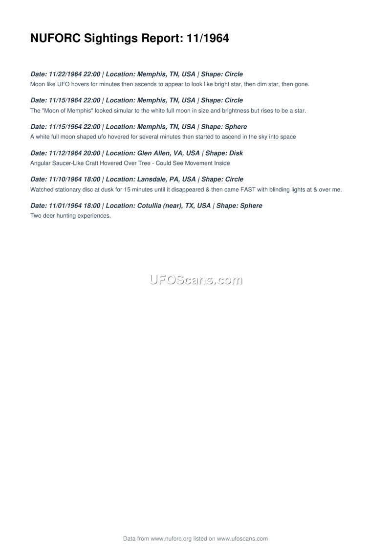 This document is a compilation of UFO sighting reports from November 1964, provided by the National UFO Reporting Center (NUFORC). The report lists six distinct incidents occurring across the United States, specifically in Tennessee, Virginia, Pennsylvania, and Texas. The sightings involve various shapes, including circles, spheres, and a disk. In Memphis, Tennessee, multiple reports describe moon-like objects that hovered before ascending or changing appearance. In Glen Allen, Virginia, a witness reported an angular, saucer-like craft hovering over a tree with visible movement inside. A report from Lansdale, Pennsylvania, describes a stationary disc that disappeared and then returned with blinding lights. Finally, a report from near Cotullia, Texas, mentions two deer hunting experiences involving a sphere-shaped object. The document serves as a historical record of these reported phenomena.