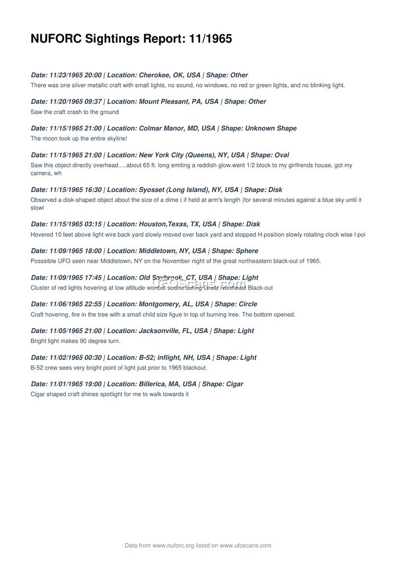 A chronological list of twelve UFO sightings reported in the United States during November 1965. The reports include diverse descriptions of aerial phenomena, some occurring during the Great Northeast Blackout.