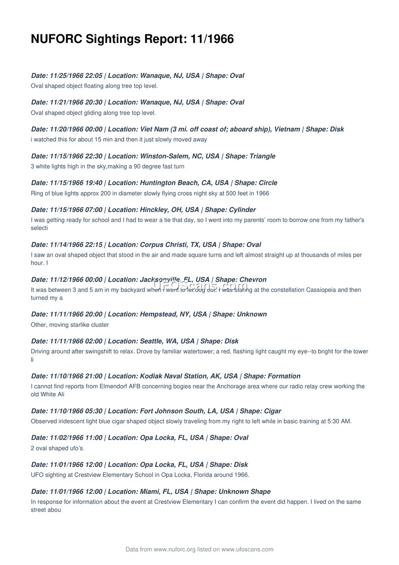 This document provides a chronological list of UFO sightings reported to the National UFO Reporting Center during November 1966. It includes diverse accounts from across the United States and Vietnam, detailing various object shapes and behaviors.