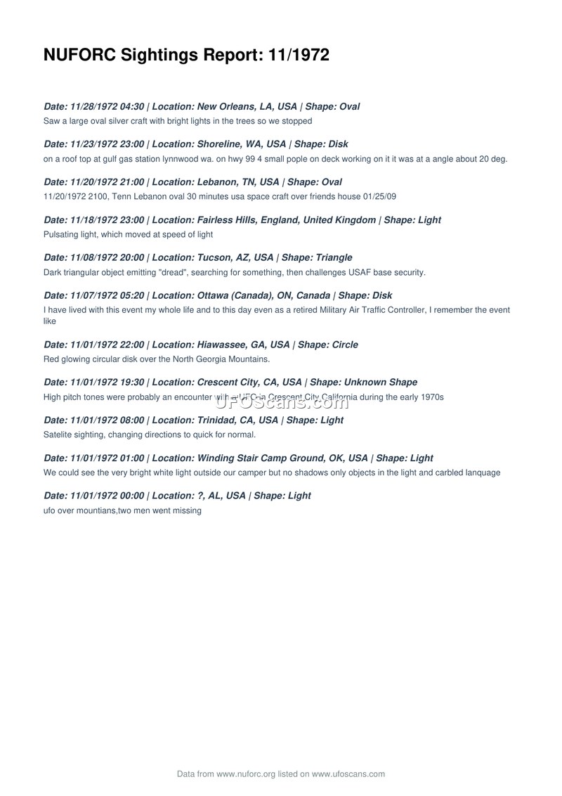 This document is a compilation of UFO sighting reports from November 1972, sourced from the National UFO Reporting Center (NUFORC). It lists eleven distinct incidents occurring across various locations, primarily in the United States, but also including Canada and the United Kingdom. The reports describe a variety of phenomena, including oval, disk, and triangular craft, as well as unidentified lights. Specific details vary by entry: some reports mention physical interactions or observations, such as a craft seen in trees in New Orleans, workers on a roof in Shoreline, Washington, and a dark triangular object that reportedly challenged USAF base security in Tucson, Arizona. Other reports involve more abstract observations, such as high-pitched tones in Crescent City, California, and a report from a retired Military Air Traffic Controller regarding an event in Ottawa, Canada. The document also notes a more severe incident in Alabama where two men reportedly went missing in connection with a sighting over mountains. The reports are presented as brief summaries of witness accounts, documenting the date, location, and shape of the observed phenomena.