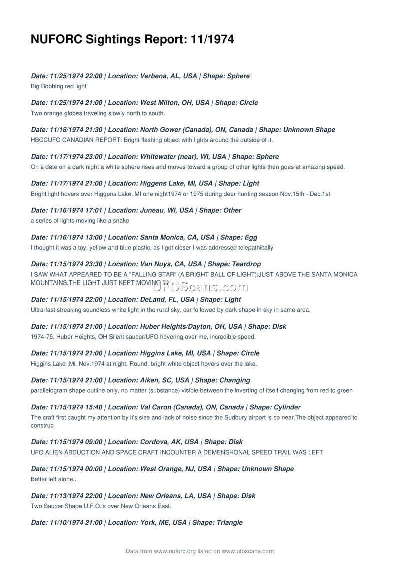 This document is a compilation of UFO sighting reports from November 1974, sourced from the National UFO Reporting Center (NUFORC). The report lists various incidents occurring across the United States and Canada, with one report originating from the United Kingdom. The sightings describe a wide variety of phenomena, including spheres, disks, circles, triangles, cylinders, and lights. Witnesses reported diverse behaviors, such as hovering, rapid movement, and in one instance, a telepathic encounter. Locations mentioned include various states in the U.S. such as Alabama, Ohio, Wisconsin, Michigan, California, Florida, South Carolina, Alaska, New Jersey, Louisiana, Maine, North Carolina, Pennsylvania, Arkansas, Tennessee, Iowa, and Texas, as well as Ontario, Canada, and Buckinghamshire, England. The reports vary in detail, ranging from brief descriptions of lights to more complex accounts involving physical characteristics like landing legs or specific shapes. The document serves as a chronological record of these reported events during the specified month.