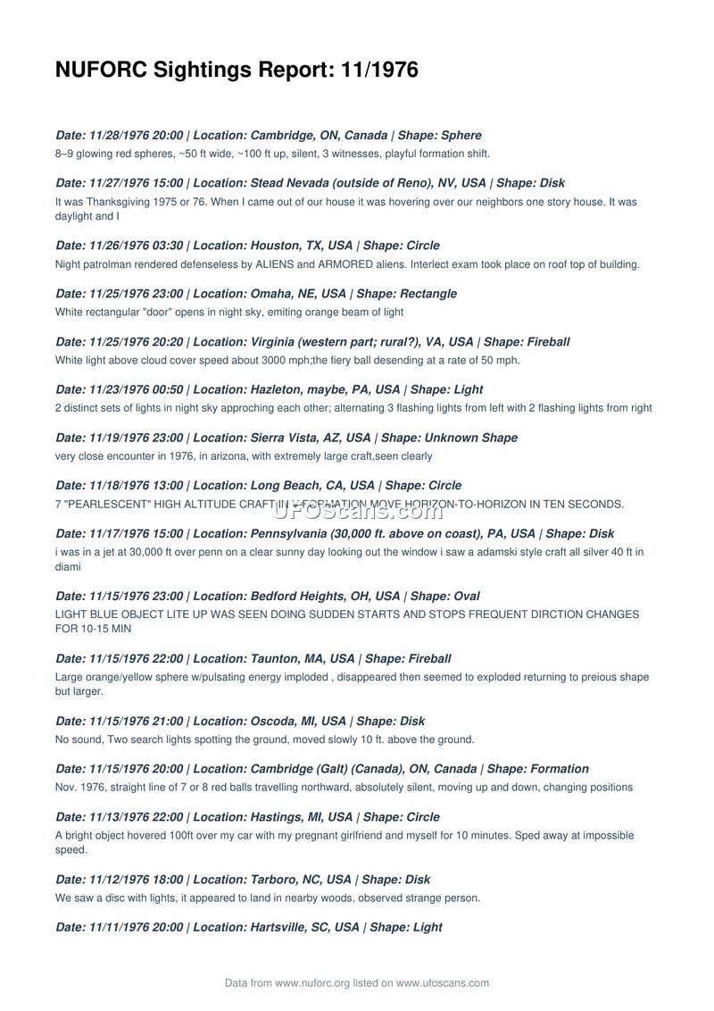 A compilation of UFO sighting reports from November 1976, documenting various aerial phenomena observed globally. The reports include descriptions of diverse shapes, behaviors, and encounters reported to the National UFO Reporting Center.