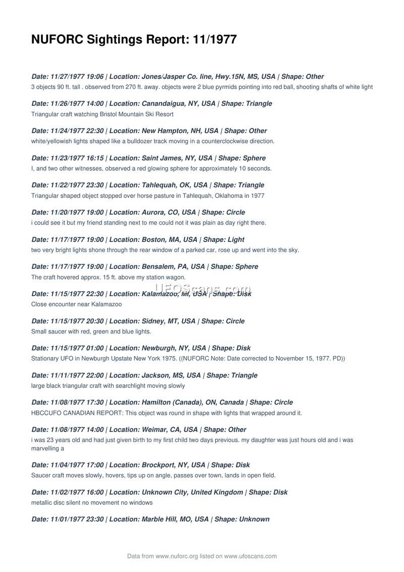 A monthly compilation of sixteen UFO sighting reports from November 1977, documented by NUFORC. The reports detail various aerial phenomena observed across North America and the United Kingdom.
