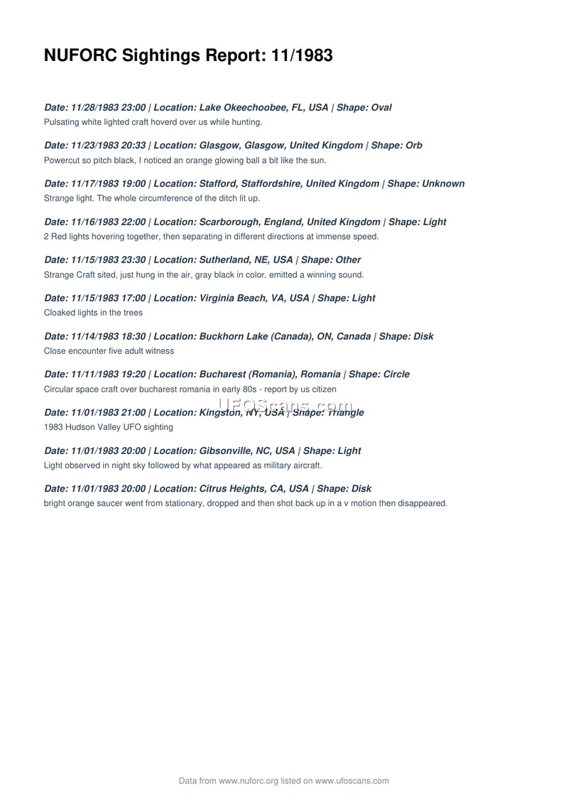 This document is a compilation of UFO sightings reported to the National UFO Reporting Center (NUFORC) during the month of November 1983. The report lists eleven distinct incidents occurring across various international locations, including the United States, the United Kingdom, Canada, and Romania. The sightings describe a variety of phenomena, ranging from pulsating white oval craft and orange glowing orbs to circular space craft and saucer-shaped objects. Specific incidents include a report of a craft in Lake Okeechobee, Florida, a power-cut associated with an orange orb in Glasgow, and a close encounter involving five adult witnesses at Buckhorn Lake, Canada. Other reports mention cloaked lights in trees in Virginia Beach, a circular craft over Bucharest, and a triangle-shaped object in Kingston, New York. The document also notes a sighting in Gibsonville, North Carolina, where a light was observed followed by what appeared to be military aircraft, and a saucer in Citrus Heights, California, that performed a V-shaped motion before disappearing. The data is presented as a chronological list of sightings, providing the date, time, location, and shape of the reported objects for each entry.
