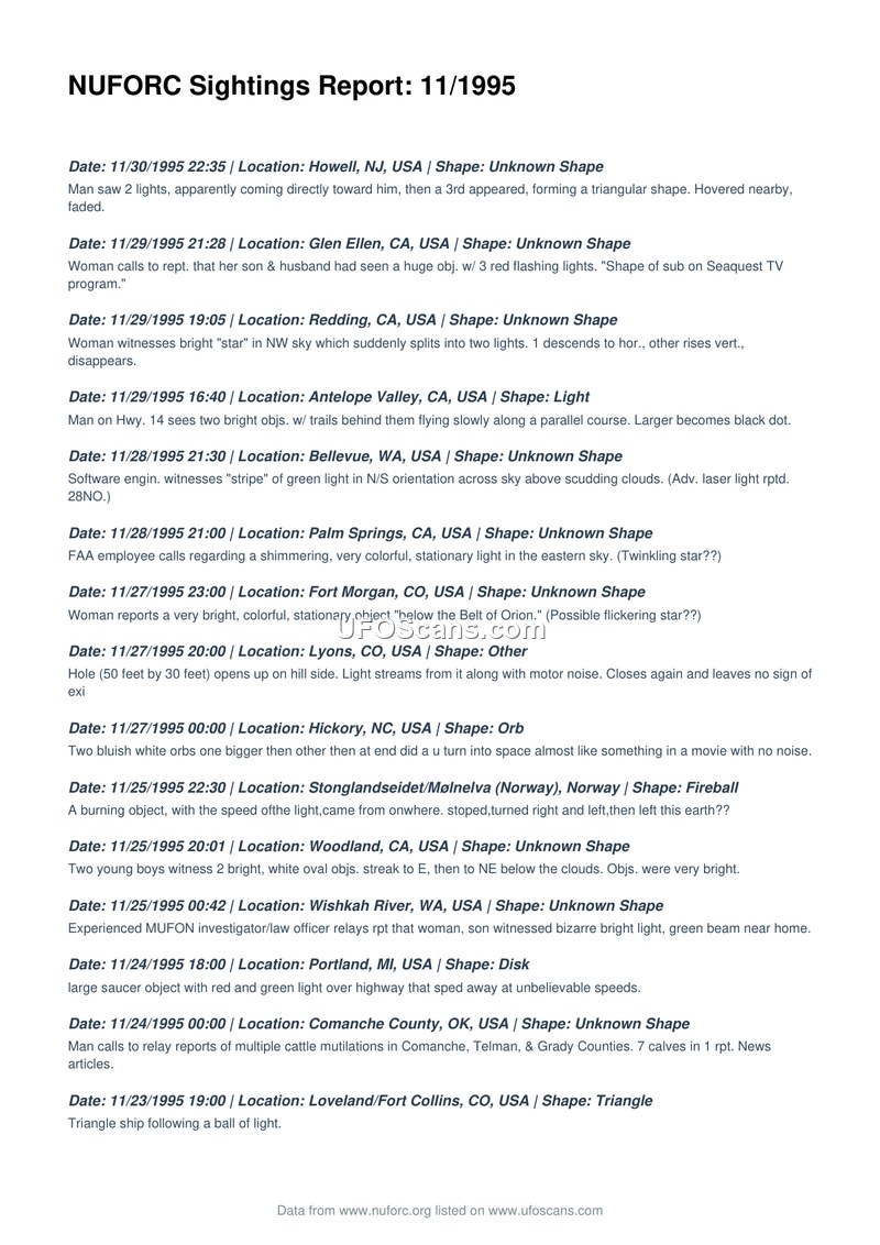 This document is a monthly log of UFO sightings reported to the National UFO Reporting Center in November 1995. It catalogs diverse aerial phenomena observed globally, ranging from simple light sightings to complex craft maneuvers.