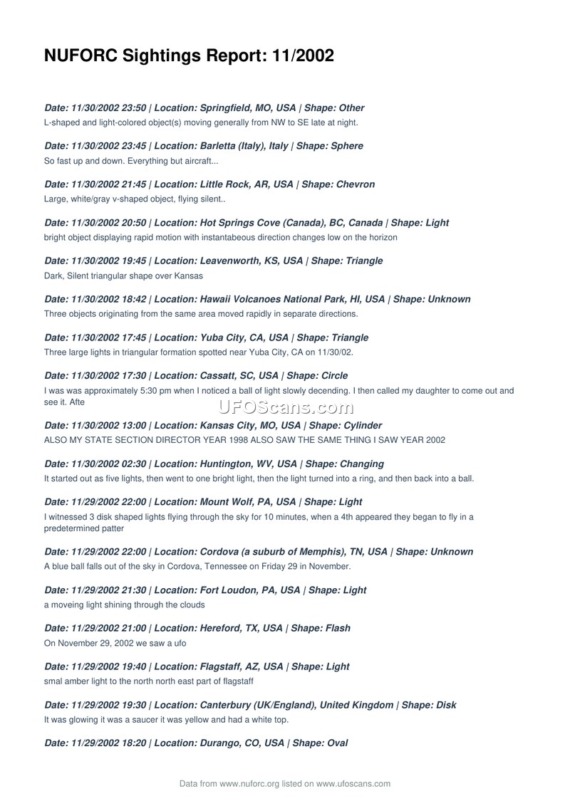 This document is a comprehensive compilation of UFO and UAP sighting reports collected by the National UFO Reporting Center (NUFORC) for the month of November 2002. The report spans 18 pages and details hundreds of individual accounts submitted by witnesses from across the United States and various international locations, including Italy, Canada, the United Kingdom, Australia, Mexico, Germany, Cyprus, Turkey, Honduras, Egypt, Pakistan, and China. The sightings are presented in reverse chronological order, beginning with reports from November 30, 2002, and concluding with entries from early November 2002. The descriptions provided by witnesses vary significantly in nature and detail. Reported shapes include spheres, triangles, chevrons, disks, cylinders, fireballs, ovals, and various unidentified lights. Many reports describe objects exhibiting rapid, erratic, or silent movement, while others note stationary objects or formations of multiple lights. Several witnesses report objects interacting with or appearing near aircraft, meteor showers, or military installations. Some accounts mention specific physical characteristics, such as metallic surfaces, color changes, or the emission of trails. A recurring theme throughout the document is the association of sightings with the Leonid meteor shower, which occurred during this period, leading some witnesses to question whether their observations were related to the event or were distinct phenomena. The document also includes anecdotal reports of objects crashing, hovering, or performing complex maneuvers. The reports are largely anecdotal, reflecting the subjective experiences of the observers, and do not contain official military or government investigations or conclusions. The document serves as a raw data repository for public-submitted sightings during this specific timeframe.