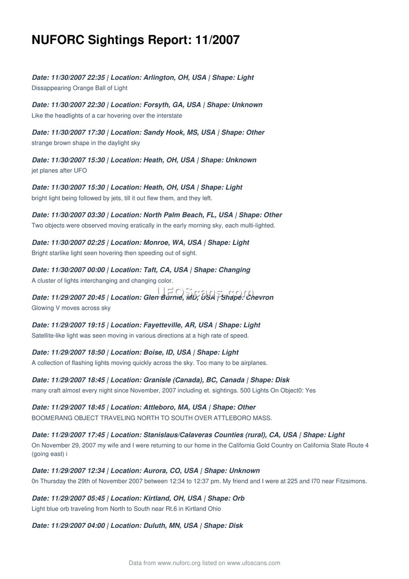 NUFORC Sightings Report: 11/2007
