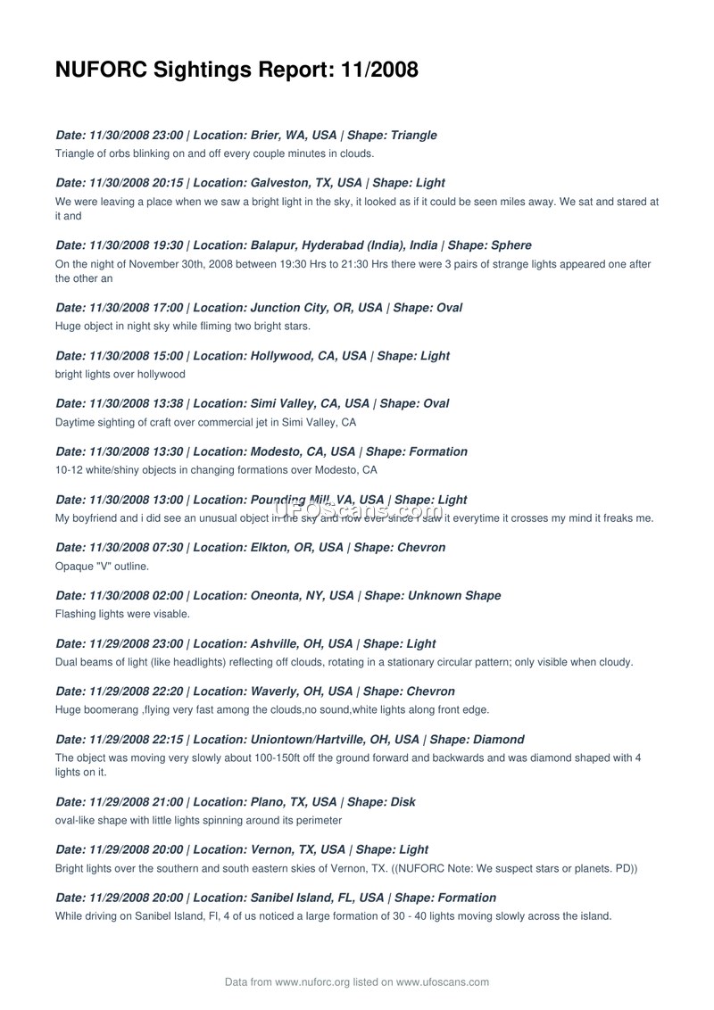 This document is a comprehensive compilation of Unidentified Aerial Phenomena (UAP) sighting reports collected by the National UFO Reporting Center (NUFORC) for the month of November 2008. The report consists of a chronological list of hundreds of individual accounts submitted by witnesses from various locations across the United States, Canada, the United Kingdom, India, Brazil, Finland, and other international sites. Each entry provides the date, time, location, and a brief description of the observed object or phenomenon. The shapes reported are highly diverse, including triangles, spheres, disks, cigars, chevrons, fireballs, and various light formations. Many reports describe objects that exhibit unusual flight characteristics, such as rapid acceleration, hovering, silent movement, or sudden disappearance. In several instances, the NUFORC staff provided brief notes suggesting potential conventional explanations for the sightings, such as the planets Venus and Jupiter, stars, or meteors. Some reports mention specific interactions or environmental impacts, such as electronic interference with vehicles or phones, and sightings occurring near military installations or commercial aircraft. The document serves as a raw data repository for public reports of anomalous aerial activity during this specific timeframe, reflecting the wide range of subjective experiences and observations reported to the center.