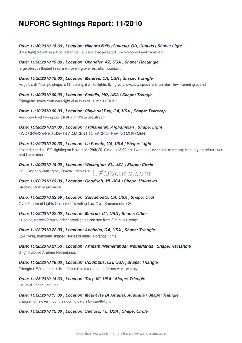 This document is a comprehensive compilation of Unidentified Aerial Phenomena (UAP) sighting reports submitted to the National UFO Reporting Center (NUFORC) for the month of November 2010. The report spans 22 pages and details hundreds of individual accounts from witnesses across the United States, Canada, the United Kingdom, Australia, Mexico, Iceland, Spain, Slovakia, South Africa, and Ireland. The sightings are presented in reverse chronological order, beginning with reports from November 30, 2010, and concluding with reports from November 1, 2010. The descriptions provided by witnesses vary significantly in detail and terminology. Common shapes reported include triangles, circles, spheres, lights, ovals, cigars, teardrops, and various formations. Witness accounts frequently describe anomalous flight characteristics, such as hovering, rapid acceleration, silent movement, sudden changes in direction, and the ability to change shape or color. Many reports mention specific lighting patterns, such as flashing red, blue, or white lights, and some witnesses describe objects as metallic or chrome-like. Several entries include notes from NUFORC staff, which occasionally offer alternative explanations, such as 'twinkling stars' or 'balloons,' while other reports remain unverified. The document captures a wide range of witness experiences, from casual observations of lights in the sky to more detailed encounters involving low-altitude objects, formations of multiple craft, and interactions with military aircraft. Some reports mention the use of technology, such as night vision goggles, telescopes, and cameras, to observe or document the phenomena. The report also contains occasional anecdotal remarks from witnesses, including expressions of skepticism, fear, or personal theories regarding the nature of the objects, such as secret government military craft or extraterrestrial origins. The document serves as a raw data repository for public-submitted UAP reports during this specific timeframe.
