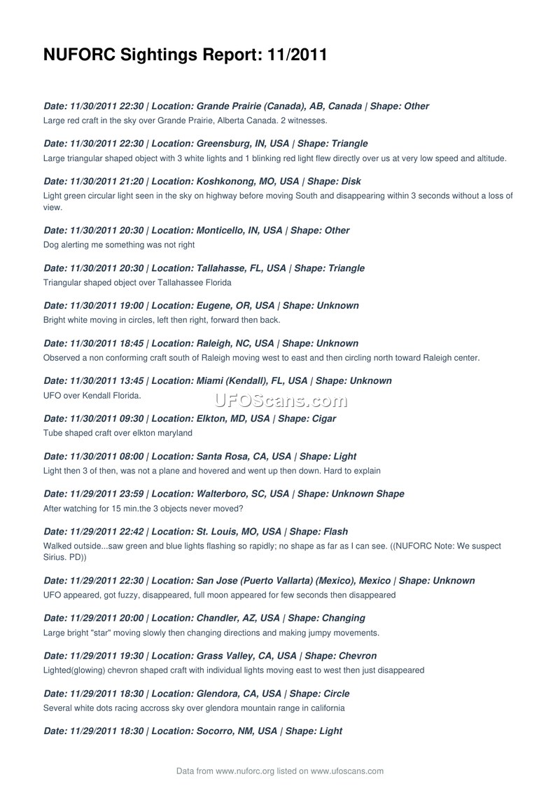This document is a chronological compilation of hundreds of UAP sighting reports submitted to the National UFO Reporting Center during November 2011. It provides a global overview of witness accounts describing diverse aerial objects and light phenomena.