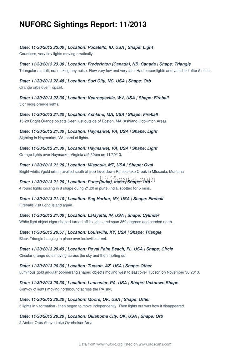 This document is a monthly compilation of hundreds of civilian UFO sighting reports submitted to the National UFO Reporting Center in November 2013. It provides a chronological record of witness accounts detailing various shapes, behaviors, and locations of UAP sightings globally.