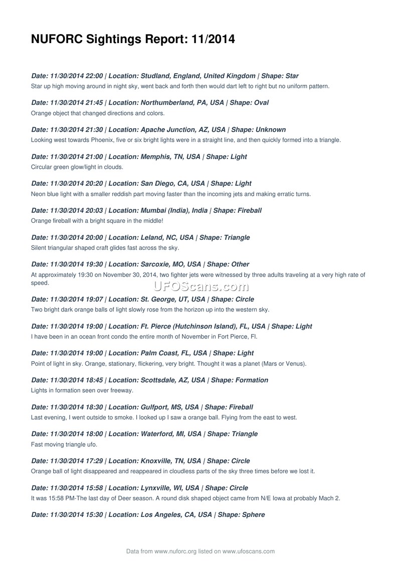 This document is a monthly compilation of hundreds of UAP sighting reports submitted to the National UFO Reporting Center in November 2014. It provides a global record of witness accounts detailing diverse object shapes, behaviors, and locations.