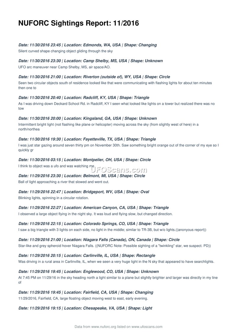 This document is a comprehensive compilation of Unidentified Aerial Phenomena (UAP) sighting reports submitted to the National UFO Reporting Center (NUFORC) during the month of November 2016. The report consists of a chronological list of individual sightings, spanning from November 1st through November 30th, 2016. Each entry provides the date and time of the event, the location (primarily within the United States, with some reports from Canada, the United Kingdom, Japan, Bulgaria, and Malaysia), and the reported shape of the object. The descriptions provided by witnesses vary significantly in detail and nature. Reported shapes include circles, triangles, spheres, orbs, fireballs, cigars, rectangles, diamonds, chevrons, and various 'light' or 'changing' configurations. Witness accounts describe a wide range of behaviors, including stationary hovering, erratic movement, high-speed flight, formation flying, and sudden disappearances. Some reports mention specific environmental or situational contexts, such as proximity to airports, military training areas, or specific landmarks. Several entries include brief notes from NUFORC staff, which occasionally offer potential conventional explanations for the sightings, such as celestial bodies (e.g., Sirius, planets), lens flares, meteor activity, or advertising lights. The document serves as a raw data repository of public-submitted accounts rather than an analytical intelligence assessment. The reports reflect the subjective experiences of observers, ranging from casual star-gazers to individuals who felt the phenomena were intelligent or anomalous in nature. The document provides a snapshot of the volume and diversity of UAP reports received by the organization during this specific period.