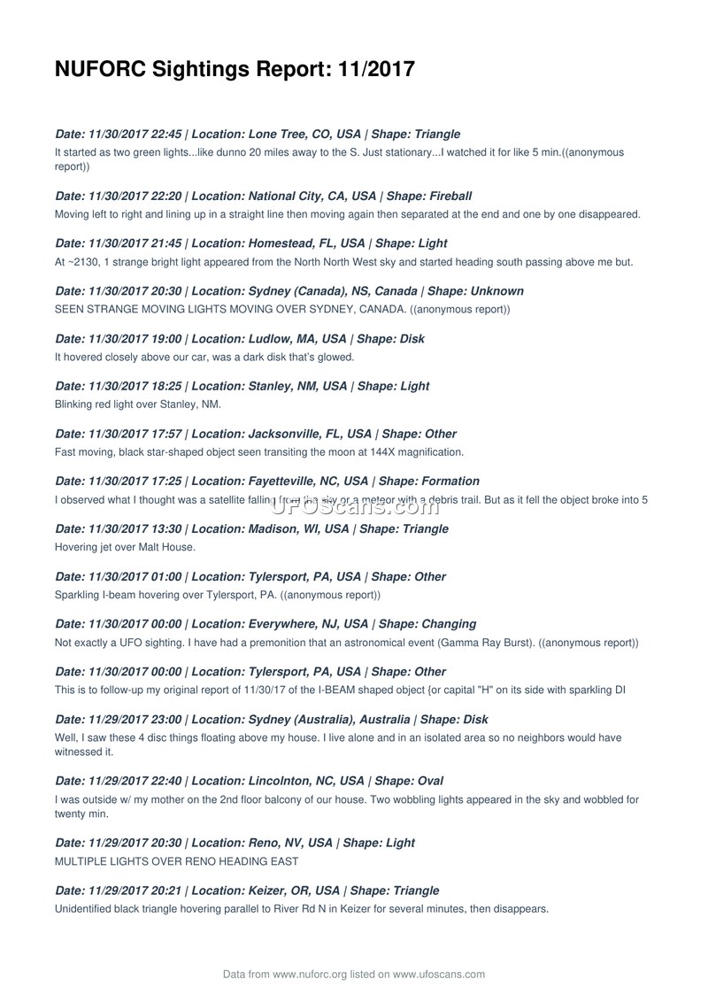 This document is a comprehensive compilation of sighting reports submitted to the National UFO Reporting Center (NUFORC) during the month of November 2017. The report lists hundreds of individual accounts from witnesses across the United States, Canada, and several international locations, including the United Kingdom, Australia, India, and Guatemala. The sightings are presented chronologically, beginning on November 30 and extending back to November 1. The reports describe a wide variety of phenomena, including objects identified as triangles, disks, cigars, orbs, fireballs, and various light formations. Many witnesses describe objects hovering, moving at high speeds, changing colors, or performing erratic maneuvers. Some reports include specific details such as the object's appearance, the presence of sound, or the reaction of the witness. In several instances, the reports include notes from NUFORC staff, which offer potential conventional explanations for the sightings, such as the planet Sirius, the International Space Station (ISS), satellite re-entry, or lens flares. Other reports are marked as anonymous or describe events that the witnesses themselves acknowledge may not be traditional UFO sightings, such as premonitions or astronomical events. The document serves as a raw data repository for public reports of unidentified aerial phenomena, reflecting the diverse and often subjective nature of these accounts as they were submitted to the organization during that specific timeframe.