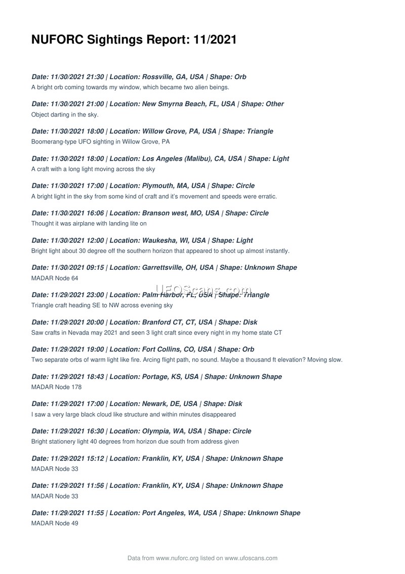 This document is a comprehensive compilation of Unidentified Aerial Phenomena (UAP) sighting reports submitted to the National UFO Reporting Center (NUFORC) during the month of November 2021. The report lists hundreds of individual entries, each detailing the date, time, location, and shape of the observed phenomenon. The sightings span a wide geographic range, primarily within the United States, but also including reports from the United Kingdom, Canada, France, India, Jordan, Norway, Switzerland, and Taiwan. The reported shapes of the objects are highly varied, including orbs, triangles, circles, disks, cigars, rectangles, fireballs, and chevron-shaped craft. Many witnesses describe erratic flight patterns, hovering, high-speed maneuvers, and silent movement. Several reports mention the use of MADAR (Multiple Anomaly Detection and Aerial Recording) nodes, indicating a technical monitoring component to some of the data collection. Other reports include anecdotal accounts of encounters with entities, communication, and interactions with conventional aircraft, such as fighter jets. Some entries note the presence of photographic or video evidence, while others mention specific environmental conditions, such as eclipses or storm activity, during the time of the sighting. The document serves as a raw data repository for public-submitted accounts, reflecting a broad spectrum of civilian observations of anomalous aerial activity throughout November 2021.