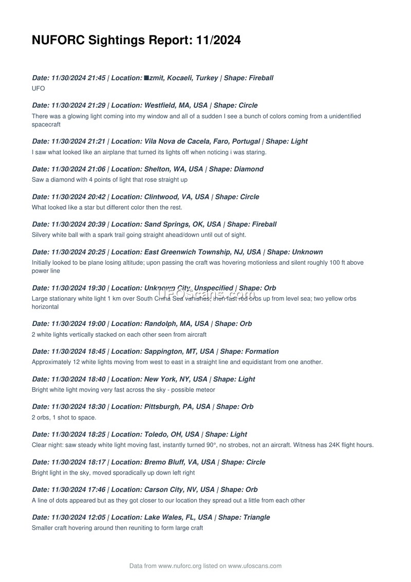 This document is a comprehensive compilation of Unidentified Aerial Phenomena (UAP) sighting reports submitted to the National UFO Reporting Center (NUFORC) for the month of November 2024. The report spans 26 pages and lists hundreds of individual accounts from witnesses across the globe, primarily in the United States, but also including reports from Turkey, Portugal, Mexico, India, Brazil, Ireland, Canada, the United Kingdom, France, Finland, Bangladesh, Belgium, Honduras, Serbia, Australia, North Macedonia, Vietnam, Italy, Morocco, Paraguay, and Luxembourg. The reports are organized chronologically, beginning with late November and moving backward through the month. Witnesses describe a wide variety of shapes, including orbs, triangles, circles, fireballs, cigars, rectangles, and chevron-shaped objects. The behaviors reported are equally diverse, ranging from stationary hovering and slow, silent movement to erratic, high-speed maneuvers, sudden appearances and disappearances, and complex formations. Many witnesses report lights of various colors, including white, red, green, blue, and orange, often noting that the objects did not behave like conventional aircraft, satellites, or meteors. Several accounts mention specific interactions or unusual circumstances, such as objects appearing near power lines, over military installations, or in proximity to commercial aircraft. Some witnesses reported physical or physiological effects, such as power outages, vibration, or physical marks on their bodies. Others provided details about capturing the phenomena on video or in photographs. The document serves as a raw data repository for public sightings, reflecting the subjective experiences of individuals who observed objects they could not identify. The reports are presented as submitted, without official analysis or categorization by the reporting center, providing a historical snapshot of public perception and reported aerial activity during this specific timeframe.