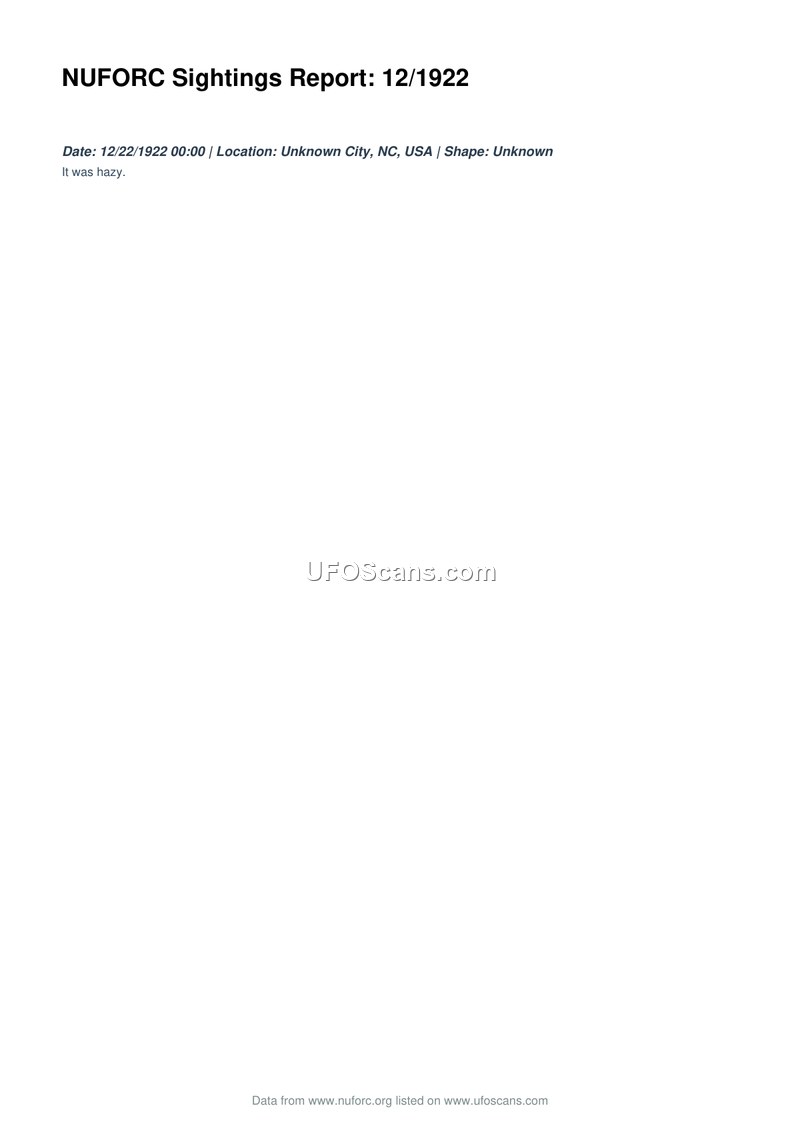 A brief NUFORC sighting report from December 22, 1922, in North Carolina. The report provides no details on the object, noting only that the weather was hazy.