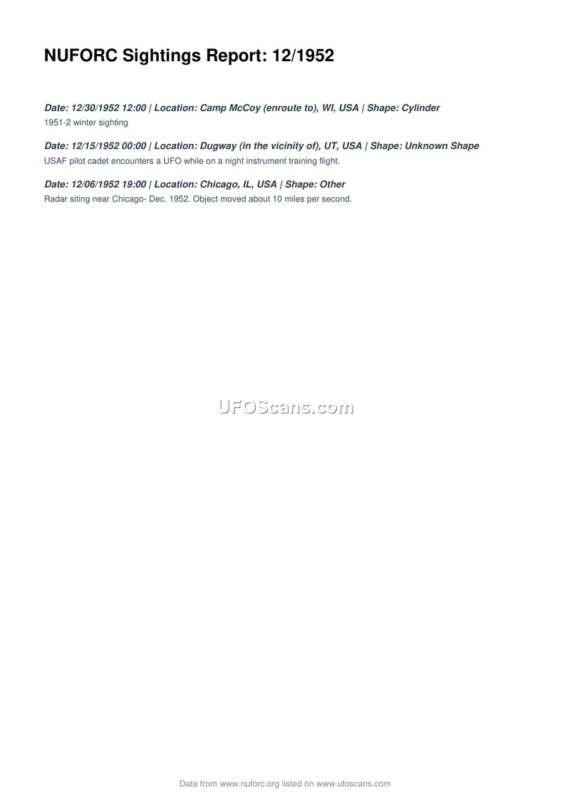 This document, titled 'NUFORC Sightings Report: 12/1952', provides a brief summary of three distinct unidentified aerial phenomena sightings reported during December 1952. The first entry describes a cylinder-shaped object sighted on December 30, 1952, while en route to Camp McCoy, Wisconsin. The second entry details an encounter on December 15, 1952, in the vicinity of Dugway, Utah, involving a USAF pilot cadet who observed a UFO during a night instrument training flight. The final entry records a radar sighting near Chicago, Illinois, on December 6, 1952, where an object was tracked moving at a speed of approximately 10 miles per second. The document serves as a compilation of these specific reports.