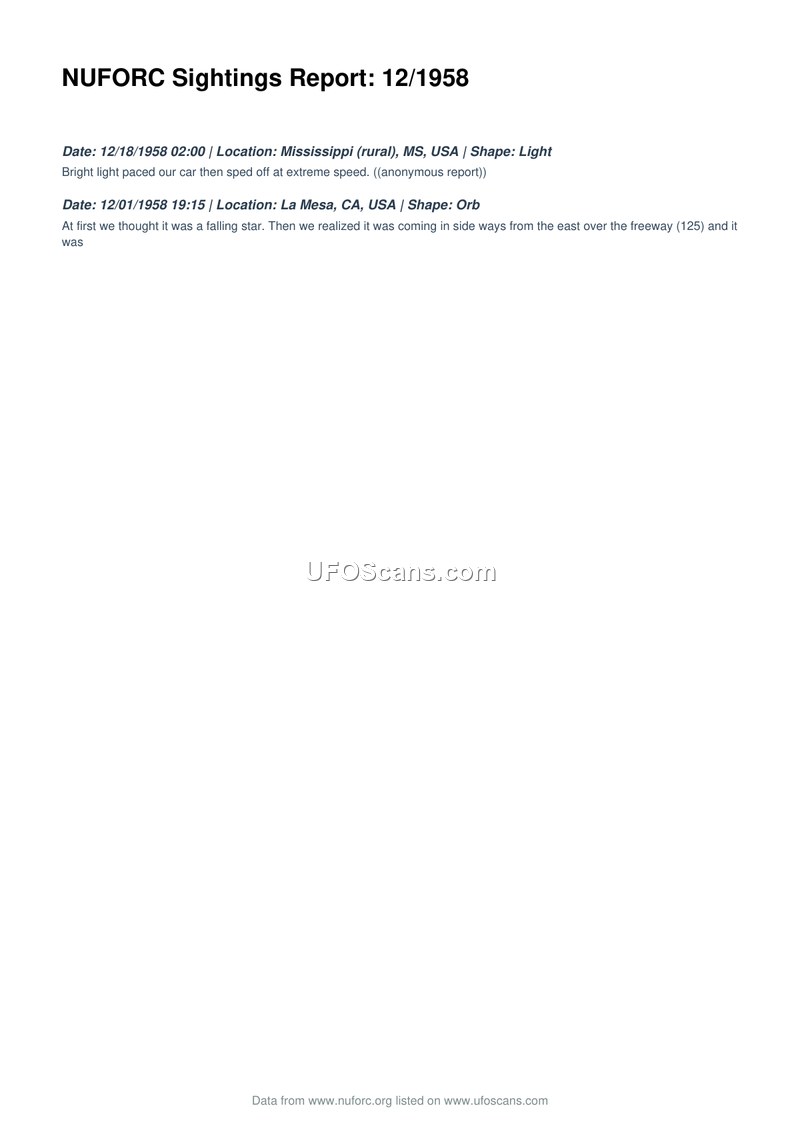 This document is a compilation of two UFO sighting reports from December 1958, sourced from the National UFO Reporting Center (NUFORC). The first incident occurred on December 18, 1958, at 02:00 in a rural area of Mississippi. The witness, who provided an anonymous report, described a bright light that paced their vehicle before departing at an extreme speed. The second incident took place on December 1, 1958, at 19:15 in La Mesa, California. The witnesses initially mistook the object for a falling star, but subsequently observed it moving sideways from the east over the freeway, specifically identified as freeway 125.