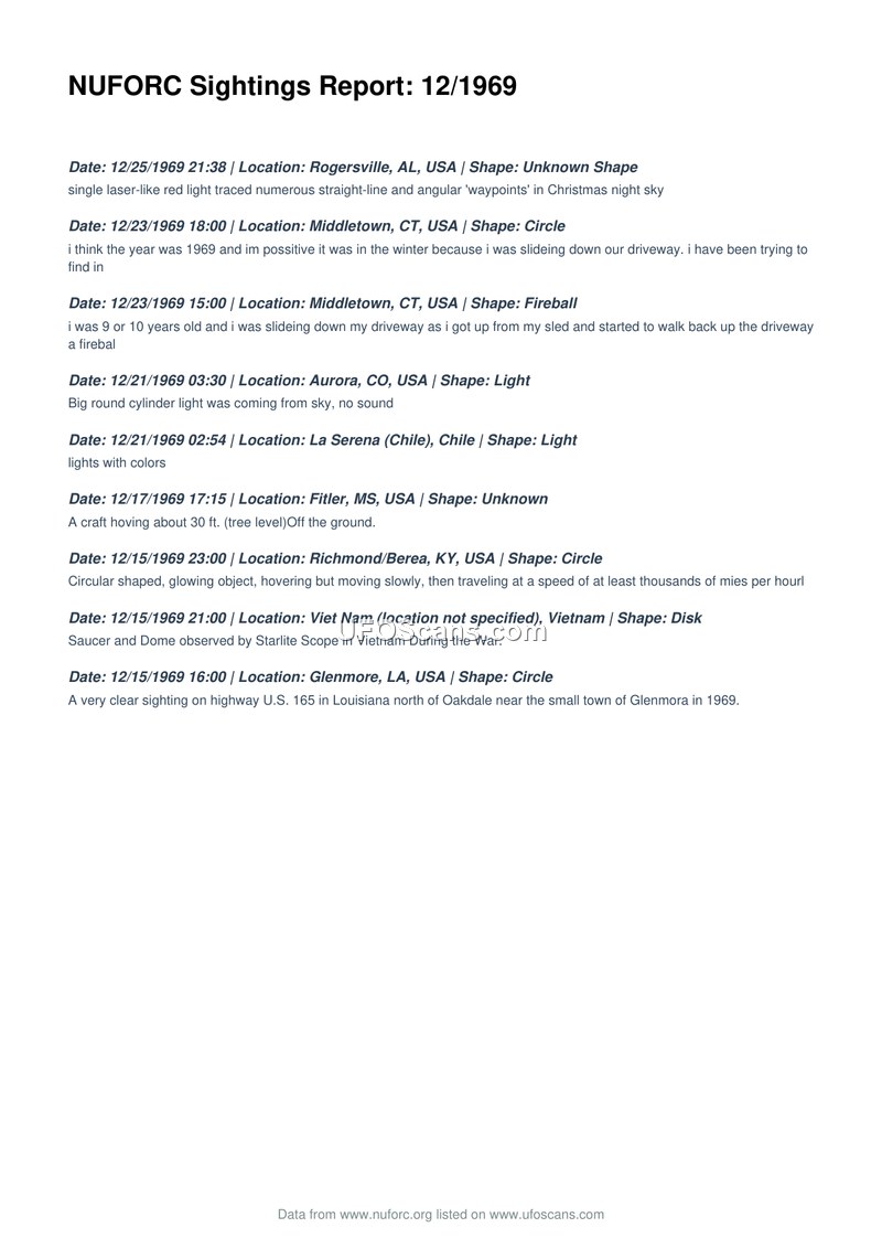 This document is a compilation of UFO sighting reports from December 1969, sourced from the National UFO Reporting Center (NUFORC). The report lists nine distinct incidents occurring between December 15 and December 25, 1969. The locations of these sightings are diverse, including Rogersville, Alabama; Middletown, Connecticut; Aurora, Colorado; La Serena, Chile; Fitler, Mississippi; Richmond/Berea, Kentucky; Vietnam; and Glenmore, Louisiana. The reported phenomena vary in description, including a single laser-like red light, circular objects, fireballs, a round cylinder light, and a saucer with a dome. Some reports include specific details, such as a craft hovering at tree level (30 feet) in Mississippi, a saucer observed via a Starlite Scope in Vietnam, and an object moving at thousands of miles per hour in Kentucky. Other entries reflect personal recollections of childhood sightings, such as the reports from Middletown, Connecticut, where witnesses recalled seeing a circle and a fireball while sledding. The document serves as a historical record of these reported aerial phenomena as cataloged by NUFORC.