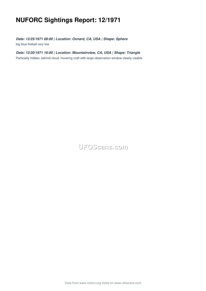 This document provides a summary of two UFO sightings reported to the National UFO Reporting Center (NUFORC) during December 1971. The first incident occurred on December 25, 1971, at 08:00 in Oxnard, California, where a sphere-shaped object described as a 'big blue fireball' was observed at a very low altitude. The second incident took place on December 20, 1971, at 16:00 in Mountainview, California. This report describes a triangle-shaped craft that was partially hidden behind a cloud. The witness noted that the craft was hovering and featured a large observation window that was clearly visible.