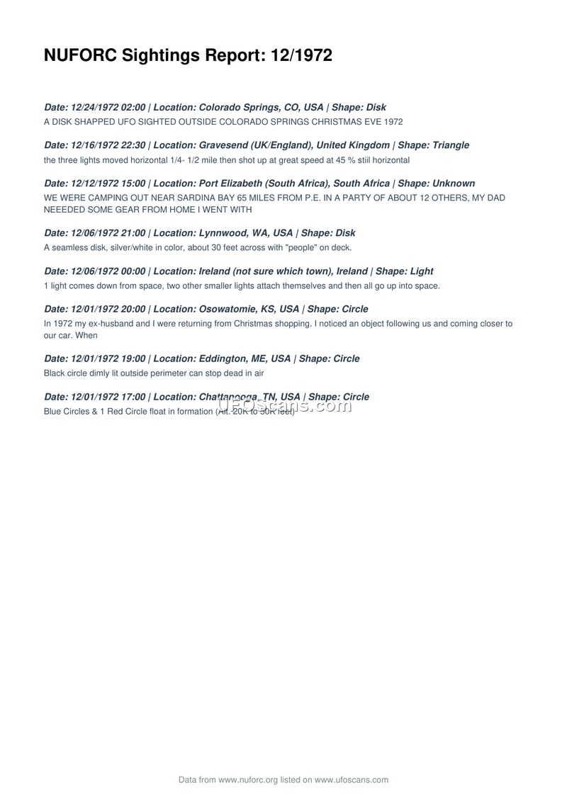 This document is a compilation of UFO sightings reported to the National UFO Reporting Center (NUFORC) for the month of December 1972. It lists eight distinct incidents occurring between December 1 and December 24, 1972. The reports span various international locations, including the United States (Colorado, Washington, Kansas, Maine, Tennessee), the United Kingdom (Gravesend), South Africa (Port Elizabeth), and Ireland. The reported phenomena vary in description, including disk-shaped objects, triangles, circles, and lights. Specific details provided in the entries include a disk-shaped object with 'people' on deck in Lynnwood, Washington; a formation of blue and red circles at an altitude of 20,000 to 50,000 feet over Chattanooga, Tennessee; and a sighting involving an object following a car in Osowatomie, Kansas. Other reports describe lights maneuvering in space or moving at high speeds. The document serves as a summary log of these reported events.