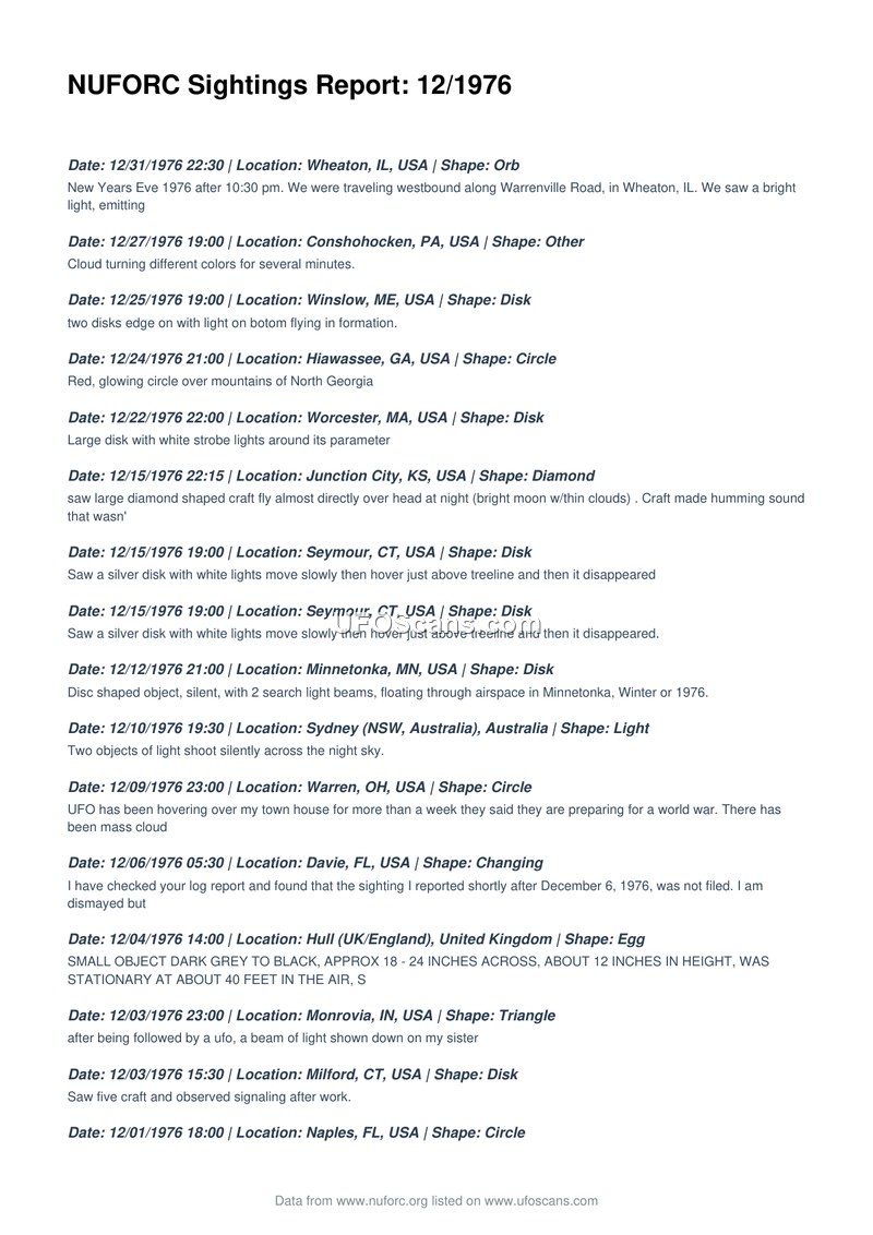 This document is a chronological list of 16 UFO sighting reports from December 1976 compiled by the National UFO Reporting Center. It documents various aerial phenomena reported globally, including descriptions of shapes, behaviors, and locations.