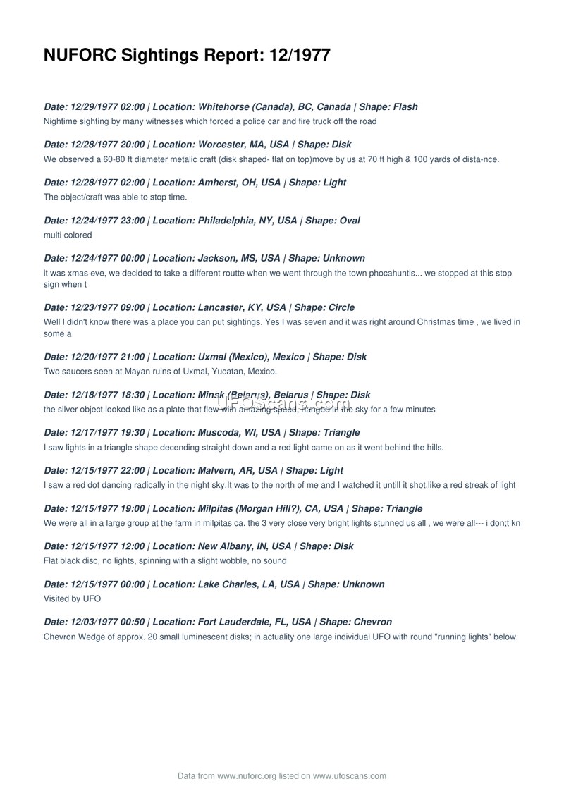 This document is a compilation of UFO sightings reported to the National UFO Reporting Center (NUFORC) during the month of December 1977. The report lists fourteen distinct incidents occurring between December 3 and December 29, 1977. The sightings span various locations, including the United States, Canada, Mexico, and Belarus. The reported phenomena vary significantly in description, ranging from a 'flash' that allegedly forced a police car and fire truck off the road in Whitehorse, Canada, to a metallic, disk-shaped craft observed in Worcester, Massachusetts. Other reports include a 'chevron' shaped object composed of approximately 20 small luminescent disks in Fort Lauderdale, Florida, and a flat black disk in New Albany, Indiana. Some witnesses described unusual behaviors, such as an object in Amherst, Ohio, that was claimed to be able to 'stop time,' and a silver object in Minsk, Belarus, that moved with 'amazing speed' before hanging in the sky. The reports also include accounts of lights in triangle formations, oval-shaped objects, and red dots dancing in the night sky. The document serves as a chronological log of these civilian reports, providing dates, times, locations, and brief descriptions of the observed phenomena as submitted to the organization.