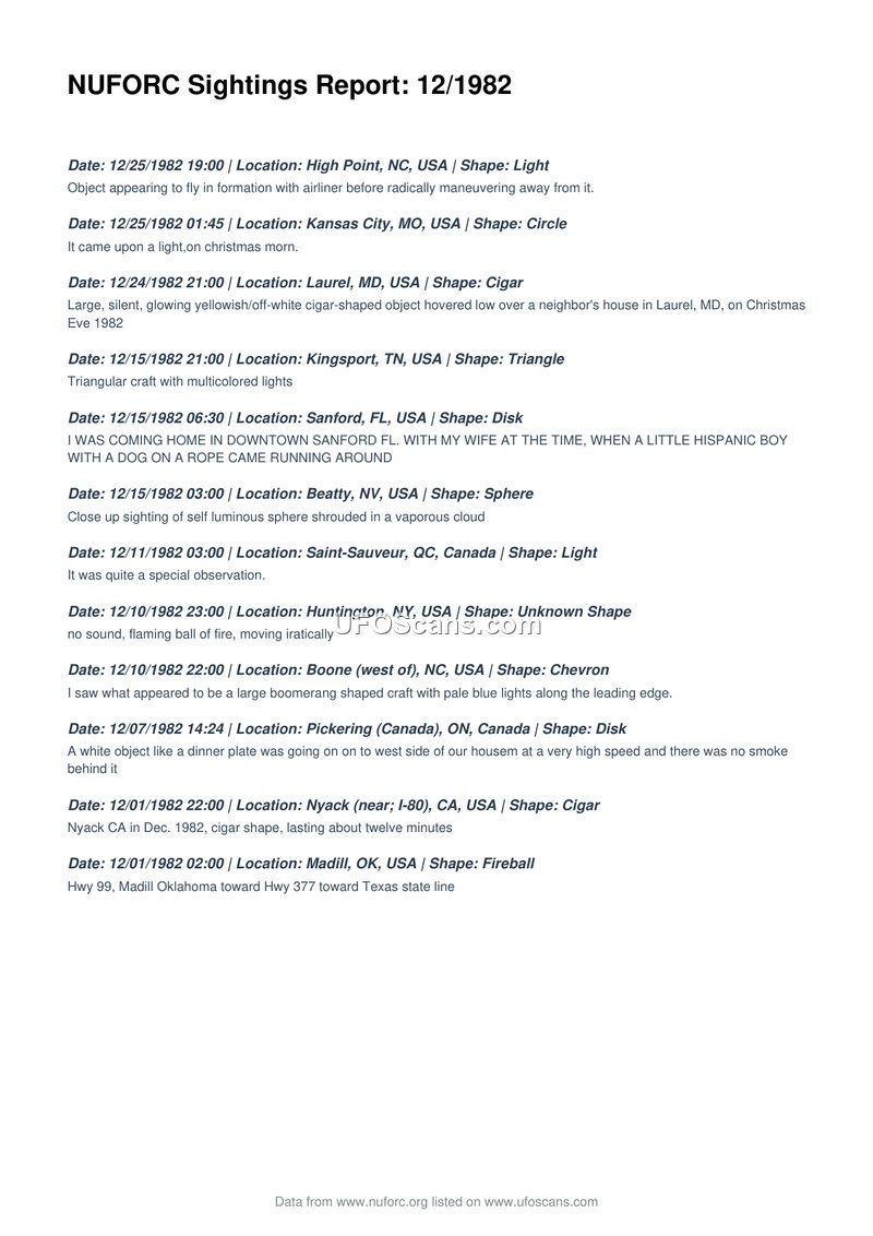 A chronological list of twelve UFO sightings reported to the National UFO Reporting Center during December 1982 across North America. The report details various object shapes, locations, and brief witness descriptions for each incident.