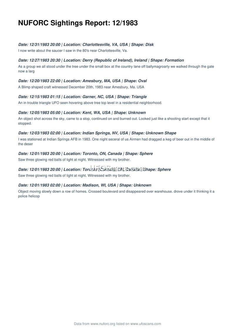 This document is a compilation of UFO sighting reports from December 1983, sourced from the National UFO Reporting Center (NUFORC). The report lists nine distinct entries spanning various locations, including Charlottesville, Virginia; Derry, Ireland; Amesbury, Massachusetts; Garner, North Carolina; Kent, Washington; Indian Springs, Nevada; Toronto, Canada; and Madison, Wisconsin. The descriptions provided by witnesses vary significantly in nature. Some reports describe specific shapes, such as a disk, an oval blimp-shaped craft, a triangle, and spheres. Other accounts describe the behavior of the objects, such as an object that shot across the sky and stopped, or an object moving slowly over a residential area in Madison. One entry notes a witness stationed at Indian Springs AFB in 1983, where several airmen were present during an event. Another entry mentions witnessing glowing red balls of light in Toronto alongside a brother. The document serves as a historical record of civilian and military-associated reports submitted to the NUFORC during that month.