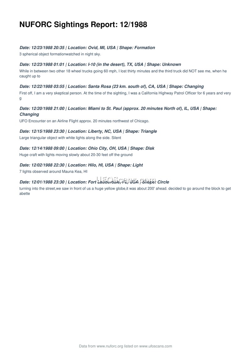 This document is a compilation of UFO sightings reported to the National UFO Reporting Center (NUFORC) during December 1988. The report lists eight distinct incidents occurring across the United States. On December 23, 1988, a formation of three spherical objects was observed in Ovid, Michigan, while in the Texas desert, a witness reported losing thirty minutes of time while driving between two 18-wheel trucks. A California Highway Patrol officer reported a 'changing' object near Santa Rosa, California, on December 22. Other reports include an airline encounter northwest of Chicago on December 20, a silent triangular object with white lights in Liberty, North Carolina, on December 15, and a disk-shaped craft hovering 20-30 feet off the ground in Ohio City, Ohio, on December 14. The list concludes with seven lights observed near Mauna Kea, Hawaii, on December 2, and a large yellow globe sighted in Fort Lauderdale, Florida, on December 1.